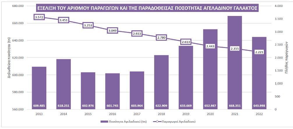 Την τελευταία 10ετία ο αριθμός των παραγωγών αγελαδινού γάλακτος μειώθηκε κατά 1,351 παραγωγούς. Από την άλλη πλευρά, ο πληθυσμός των αγελάδων για την παραγωγή γάλακτος στην Ελλάδα μειώνεται την τελευταία 10ετία, και αναμεσά στο 2013 και 2022 μειώθηκε κατά 49 χιλ. κεφάλια.