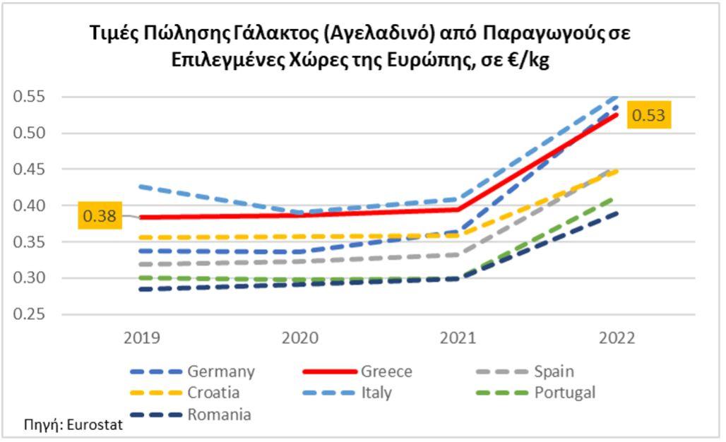 Σύμφωνα με τα στοιχεία της Eurostat η τιμή του αγελαδινού γάλακτος που έλαβαν οι κτηνοτρόφοι παρουσίασε σχετική σταθερότητα τα έτη 2019 έως το 2021 ενώ σημειώθηκε αύξηση στην τιμή το 2022 σε όλες τις χώρες της Ευρώπης που παρουσιάζονται στο παρακάτω γράφημα.