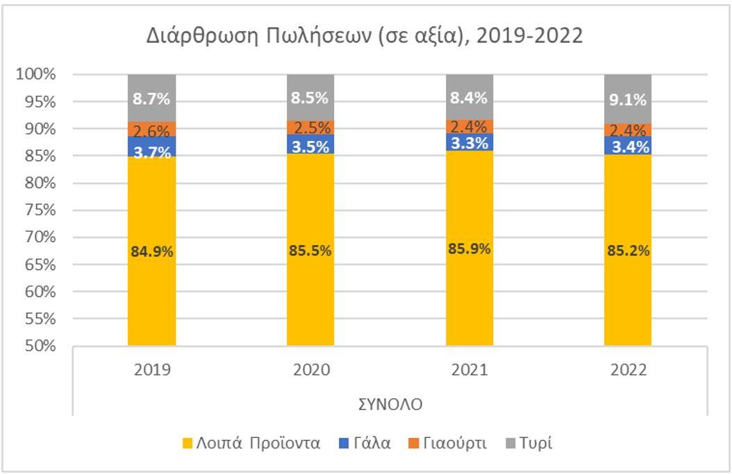 Ειδικότερα, σύμφωνα με την χαρτογράφηση της Επιτροπής Ανταγωνισμού, μεταξύ Φεβρουαρίου 2022 και Ιανουαρίου 2023, το ποσοστό του παραγωγού στην τελική τιμή αυξήθηκε από 28,8% το 2020 σε 33,9% το 2023, κυρίως λόγω της δραματικής αύξησης του κόστους παραγωγής (ζωοτροφές, ενέργεια). Αντίθετα, τα περιθώρια κέρδους της μεταποίησης και της λιανικής φάνηκε να συμπιέζονται ελαφρώς κατά την ίδια περίοδο.