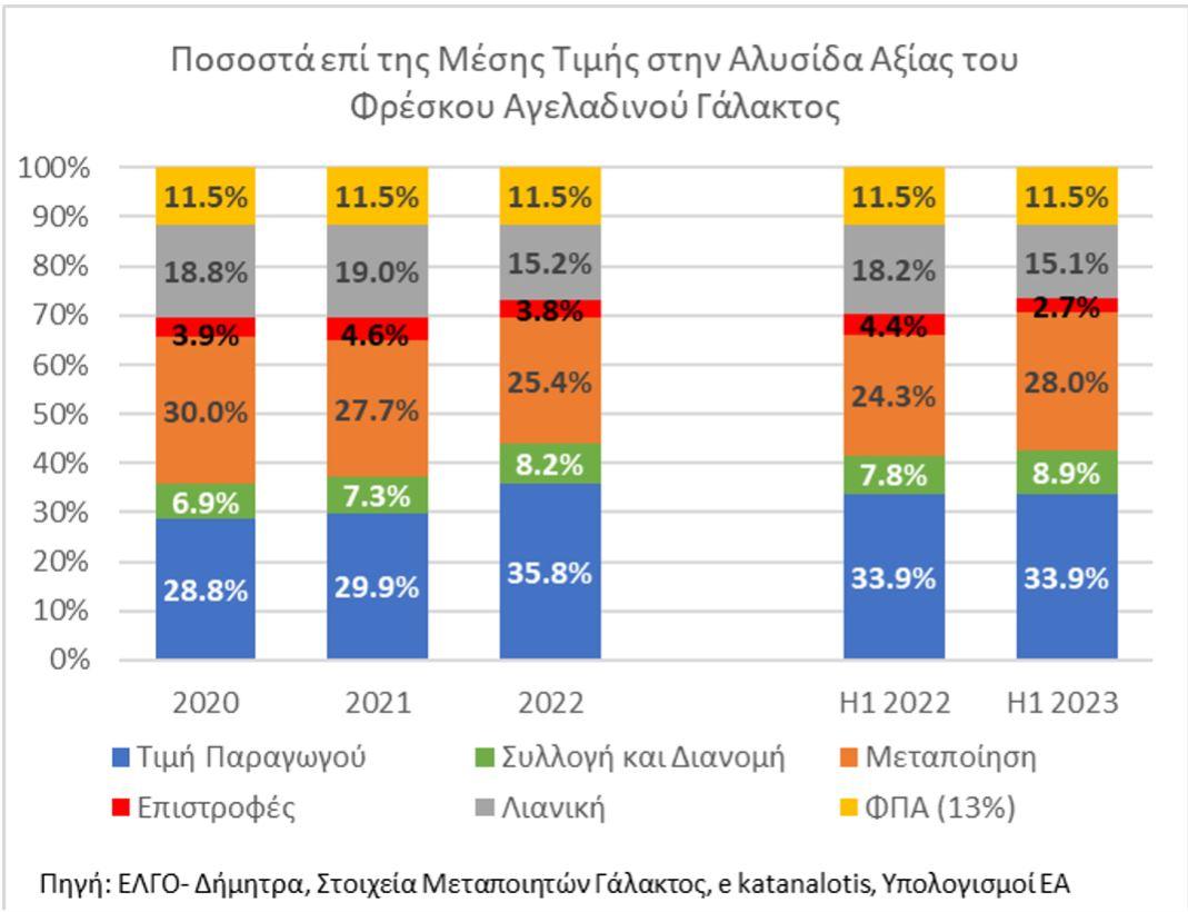 Η συμμετοχή της μεταποίησης πάνω στην διαμόρφωση της τελικής τιμής του φρέσκου αγελαδινού γάλακτος υπολογίστηκε σε 0,40 EUR/lt το 2020, και μειώθηκε σε 0,37 EUR/lt το 2021 και το 2022. Το 1ο εξάμηνο του 2023 βρέθηκε στο 0,44 EUR/lt ενώ το αντίστοιχο εξάμηνο του 2022 ήταν 0,34 EUR/lt. Παρατηρήθηκε δηλαδή μια σταδιακή συρρίκνωση της συμμετοχής της μεταποίησης στην τιμή κατά την περίοδο 2020-2022 με τάσεις ανάκαμψης το 2023.