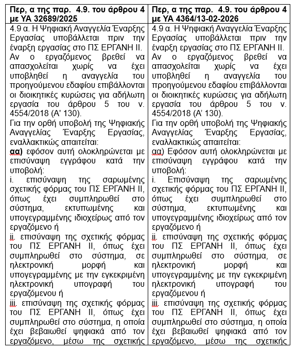 Με τη νέα απόφαση 4364/13-02-2026 τροποποιείται η απόφαση 40331/Δ1.13521/13-9-2019 όπως και η διοικητική διαδικασία με επίσημο τίτλο «Αναγγελία έναρξης εργασίας στο Π.Σ. “ΕΡΓΑΝΗ ΙΙ”»: