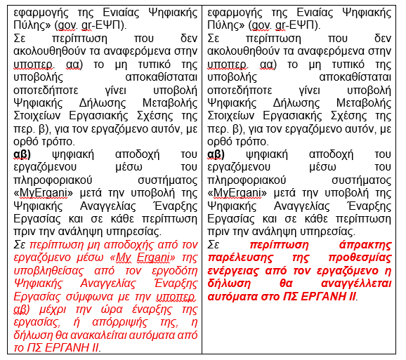 Το τελευταίο εδάφιο της υπό περίπτωσης αβ) της περ. α) της παρ. 4.9 του άρθρου 4, διαμορφώνεται ως εξής: «Σε περίπτωση άπρακτης παρέλευσης της προθεσμίας ενέργειας από τον εργαζόμενο η δήλωση θα αναγγέλλεται αυτόματα στο ΠΣ ΕΡΓΑΝΗ ΙΙ.»., η διατύπωση αυτή απομακρύνει τον κίνδυνο της αδήλωτης εργασίας, δεν είναι όπως σαφής, όπως για τον χρόνο που ανακαλείται, αυτόματα από το σύστημα.