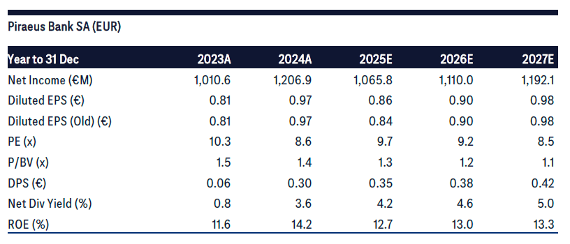 Η Citi προχώρησε σε μικρές προσαρμογές στο μοντέλο εκτιμήσεων κερδοφορίας για την Τράπεζα Πειραιώς, ενσωματώνοντας την καθοδήγηση που δόθηκε κατά την πρόσφατη ενημέρωση πριν το κλείσιμο της χρήσης (pre-close call). Οι αλλαγές επηρεάζουν κυρίως τις προβλέψεις για το 2025, με την εκτίμηση για τα κέρδη ανά μετοχή (EPS) του οικονομικού έτους 2025 να αυξάνεται κατά 2%, ενώ για τα επόμενα έτη του ορίζοντα πρόβλεψης παραμένει σε μεγάλο βαθμό αμετάβλητη.