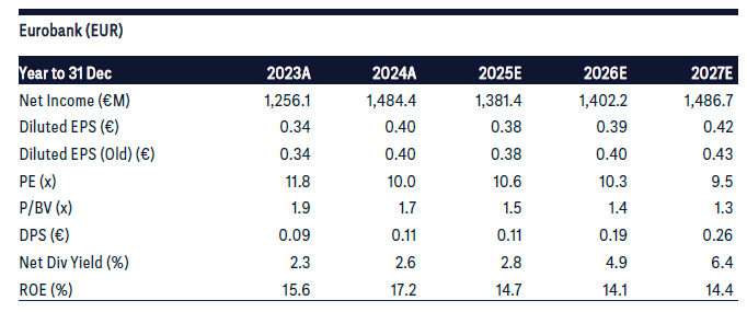 Η Citi επικαιροποίησε το μοντέλο εκτιμήσεων και για τη Eurobank, υιοθετώντας ελαφρώς πιο θετική στάση ως προς τα καθαρά έσοδα από τόκους και ενσωματώνοντας την εξαγορά της Eurolife Insurance στις προβλέψεις της. Παράλληλα, λαμβάνει υπόψη την πρόσφατη έκδοση τίτλων AT1, καθώς και την αύξηση του αριθμού μετοχών λόγω της ισχυρής πορείας της τιμής της μετοχής.