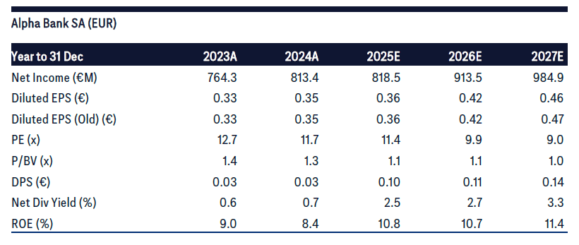 Ωστόσο, η Citi διατηρεί μια πιο επιφυλακτική εκτίμηση για τα συνολικά λειτουργικά έξοδα του Ομίλου το 2025, στα 915 εκατ. ευρώ, έναντι καθοδήγησης για περίπου 900 εκατ. ευρώ, επισημαίνοντας πρόσθετα έκτακτα κόστη που σχετίζονται με την ενσωμάτωση της Ασφαλιστικής και την έναρξη λειτουργίας της ψηφιακής τράπεζας Snappi.