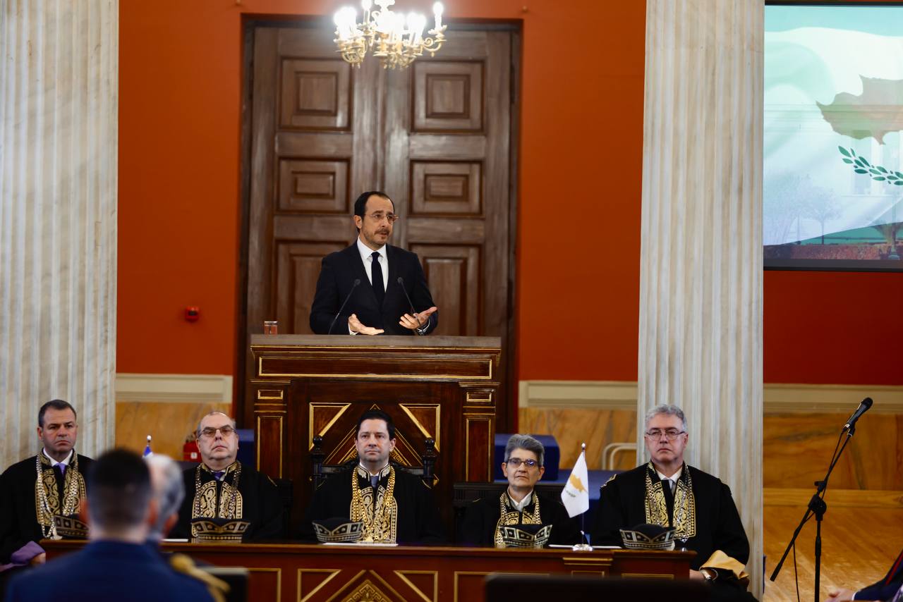 «Πριν από την όποια άλλη αναφορά επιθυμώ να εκφράσω τη θλίψη μου για την απώλεια της Ελένης Γλύκατζη-Αρβελέρ, της μεγάλης Ελληνίδας, Ελληνίδας του κόσμου, που υπηρέτησε τα γράμματα, την επιστήμη της Ιστορίας, αλλά, κυρίως, υπηρέτησε την αλήθεια. Από το βήμα του Πανεπιστημίου Αθηνών, στο οποίο φοίτησε και η ίδια, μεταφέρω εκ μέρους της Κυβέρνησης της Κυπριακής Δημοκρατίας και του κυπριακού λαού τα συλλυπητήρια μας» ανέφερε κατά τον χαιρετισμό του μεταξύ άλλων.