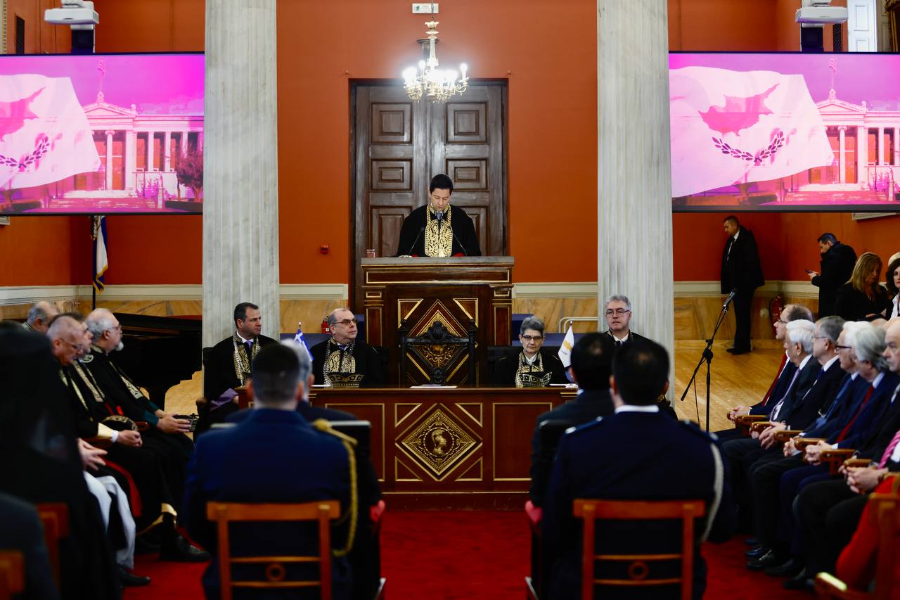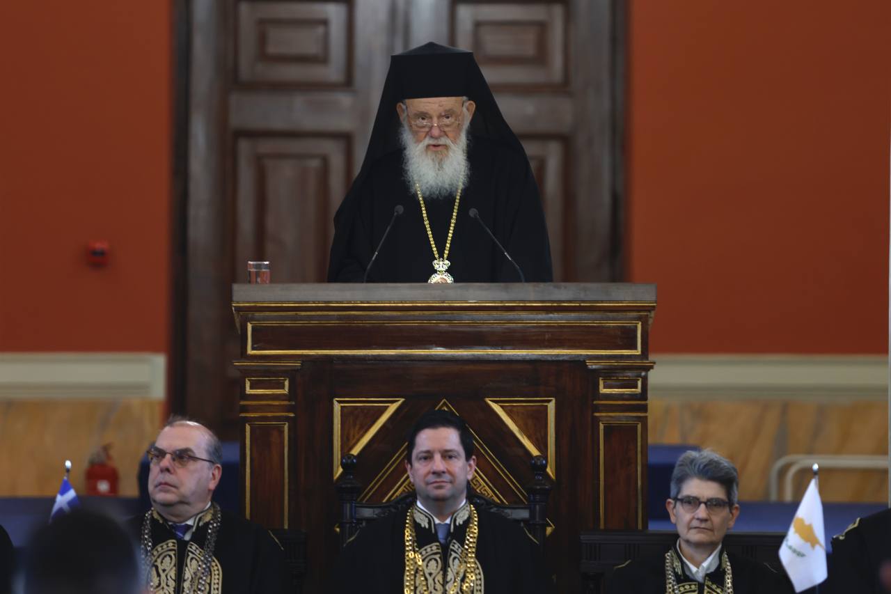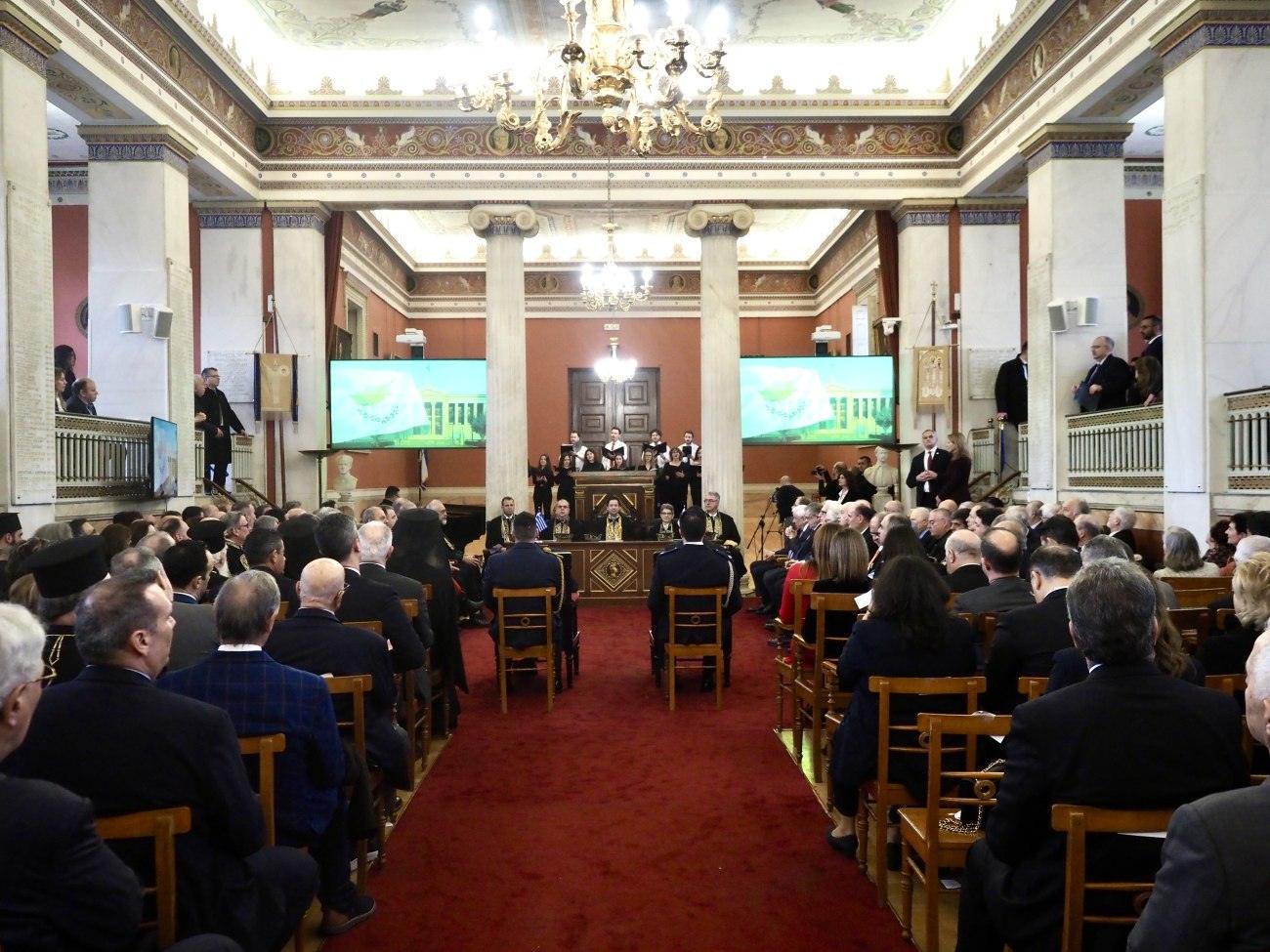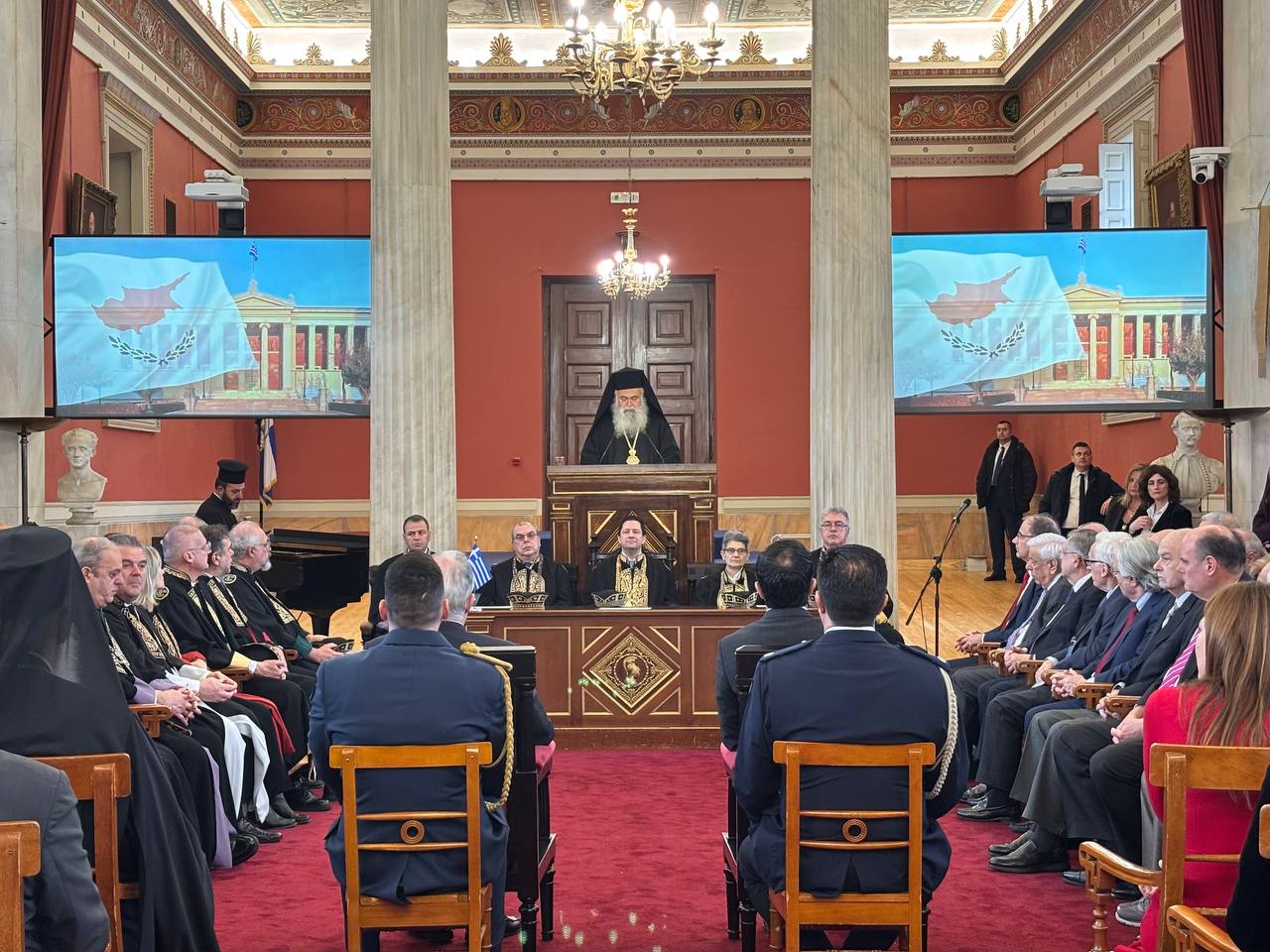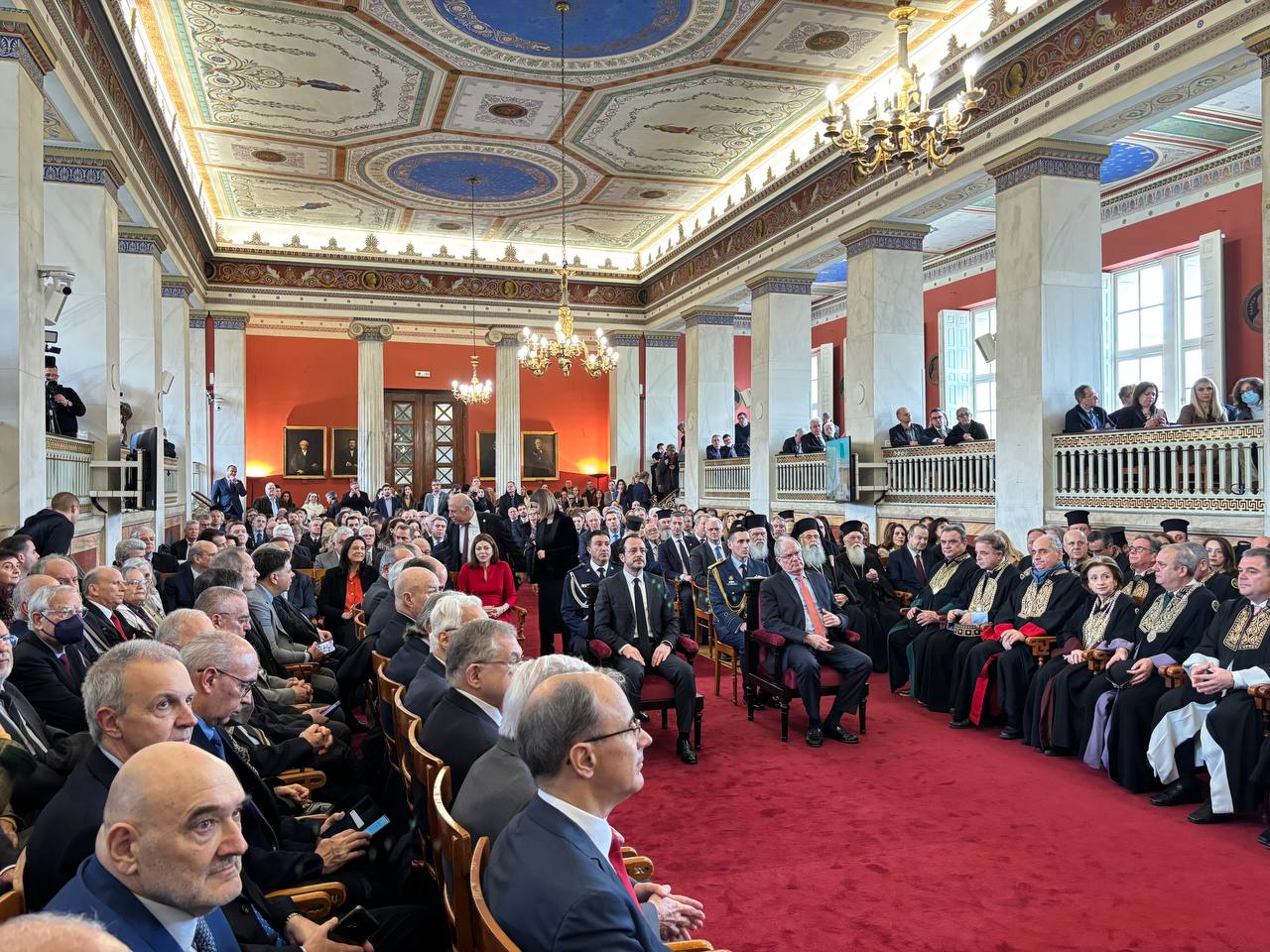 Η εκδήλωση ξεκίνησε με την υποδοχή των επίσημων προσκεκλημένων από τον Πρύτανη, καθηγητή Γεράσιμο Σιάσο, και ακολούθησαν χαιρετισμοί από τον Πρόεδρο της Ελληνικής Δημοκρατίας, κύριο Κωνσταντίνο Αν. Τασούλα, τον Πρόεδρο της Κυπριακής Δημοκρατίας, κύριο Νίκο Χριστοδουλίδη, τον Αρχιεπίσκοπο Αθηνών και πάσης Ελλάδος, κύριο Ιερώνυμο Β’, τον Αρχιεπίσκοπο Νέας Ιουστινιανής και πάσης Κύπρου, κύριο Γεώργιο και την εκπρόσωπο του Πρωθυπουργού, Υπουργό Παιδείας, Θρησκευμάτων και Αθλητισμού κυρία Σοφία Ζαχαράκη.