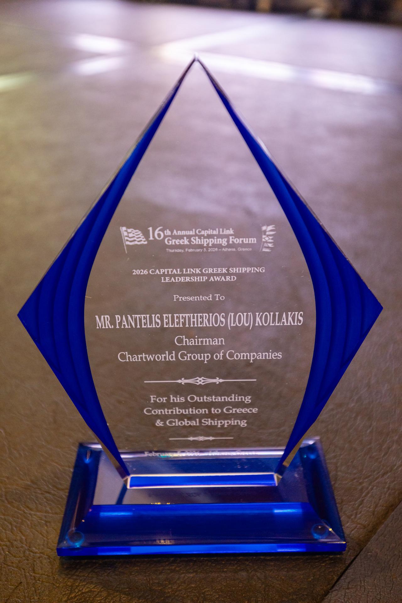 Στo επίσημο μεσημεριανό γεύμα του συνεδρίου έλαβε χώρα η τελετή βράβευσης κατά την οποία απονεμήθηκε το «2026 Capital Link Greek Shipping Leadership Award» στον κ. Παντελή Ελευθέριο (Λου) Κολλάκη, Chairman – Chartworld Group of Companies για την εξαιρετική του συμβολή στην Ελληνική και την παγκόσμια ναυτιλία.