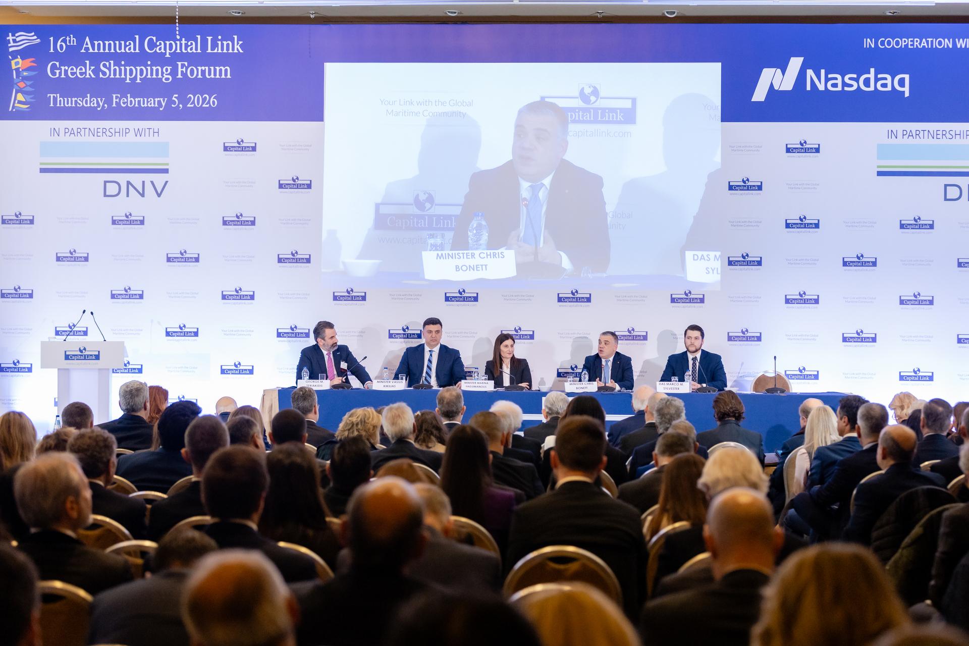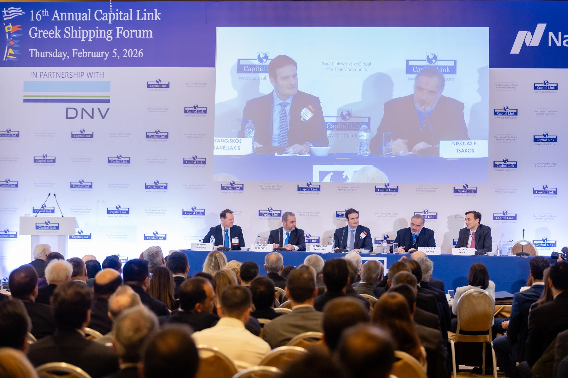 Με μοναδική επιτυχία και συμμετοχή πραγματοποιήθηκε το 16ο Ετήσιο Capital Link Greek Shipping Forum στην Αθήνα την Πέμπτη 5 Φεβρουαρίου, 2026. Το Συνέδριο διοργανώθηκε σε συνεργασία με την DNV, το Nasdaq και το NYSE.