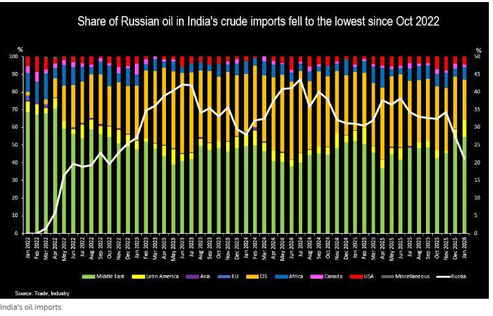 Το πετρέλαιο της Μέσης Ανατολής ισοδυναμούσε περίπου με το 55% των συνολικών εισαγωγών της Ινδίας τον Ιανουάριο, ενώ το μερίδιο των ποιοτήτων της Λατινικής Αμερικής αυξήθηκε στο υψηλότερο επίπεδο των τελευταίων 12 μηνών, περίπου 10%.