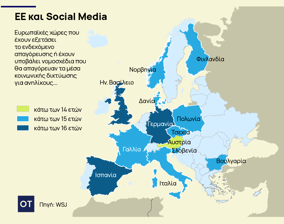 Στην Γαλλία, η κάτω Βουλή ενέκρινε πρόταση για απαγόρευση χρήσης social media σε παιδιά κάτω των 15 ετών, με στόχο η ρύθμιση να ισχύσει πριν την έναρξη της νέας σχολικής χρονιάς. Στην Ισπανία σχεδιάζεται όριο στα 16 έτη, ενώ στη Γερμανία κυβερνητικά στελέχη έχουν ταχθεί υπέρ αντίστοιχης απαγόρευσης.