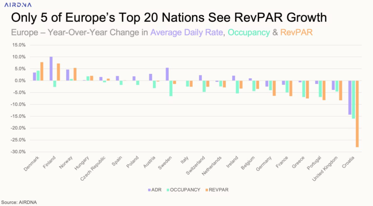 Μόλις πέντε χώρες σημείωσαν αύξηση στο RevPAR, με τη Δανία (+7,8%), τη Φινλανδία (+7,2%) και τη Νορβηγία (+5,4%) να ηγούνται της κατάταξης. Η Ισπανία διατήρησε σταθερό RevPAR χάρη στη μείωση της προσφοράς, ενώ η Κροατία εμφάνισε πτώση 28%.