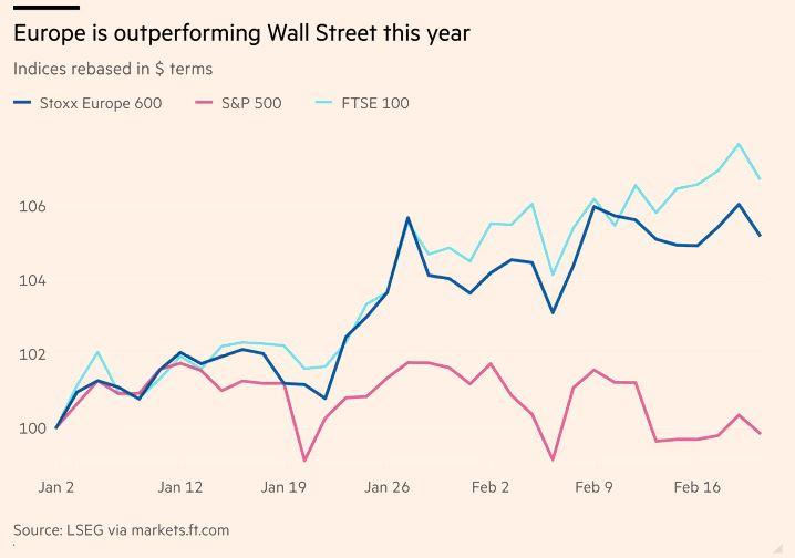Μέρες δόξας γνωρίζουν τα ευρωπαϊκά χρηματιστήρια με κεφάλαια ρεκόρ να εισρέουν από παγκόσμια κεφάλαια στη διάρκεια του Φεβρουαρίου, καθώς οι επενδυτές αναζητούν εναλλακτικές λύσεις στις ακριβές μετοχές τεχνολογίας των ΗΠΑ και να πάρουν απόσταση ασφαλείας από τις ανησυχίες για «φούσκα».