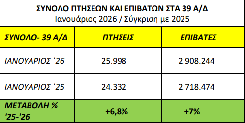 Όσον αφορά τον αριθμό κινήσεων αεροσκαφών (αφίξεις και αναχωρήσεις αεροσκαφών εσωτερικού και εξωτερικού) για τον Ιανουάριο του 2026, στο σύνολο των 39 αεροδρομίων της χώρας, των οποίων τον έλεγχο εναέριας κυκλοφορίας ασκεί, κυρίως, η ΥΠΑ, σημειώθηκε αύξηση 6,8% σε σχέση με το αντίστοιχο διάστημα του 2025. Ειδικότερα, συνολικά πραγματοποιήθηκαν 25.998 πτήσεις, έναντι 24.332 πτήσεων πέρυσι.
