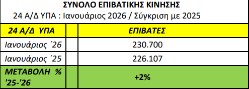 Σε ότι αφορά στην επιβατική κίνηση στα 24 αεροδρόμια διαχείρισης της ΥΠΑ (Ηράκλειο, Καλαμάτα, Αλεξανδρούπολη, Λήμνος, Αστυπάλαια, Ιωάννινα, Χίος, Κοζάνη, Καστοριά, Κάρπαθος, Κύθηρα, Μήλος, Σκύρος, Νέα Αγχίαλος, Πάρος, Σύρος, Άραξος, Νάξος, Κάλυμνος, Ικαρία, Καστελόριζο, Κάσος, Λέρος, Σητεία) αυτή παρουσίασε άνοδο 2% τον Ιανουάριο του 2026, σε σχέση με τον Ιανουάριο του 2025.
