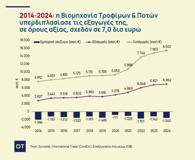 Εν τω μεταξύ, σύμφωνα με τα στοιχεία του ΙΟΒΕ την περίοδο 2014 – 2024 η βιομηχανία τροφίμων και ποτών υπερδιπλασίασε τις εξαγωγές της σε όρους αξίας, φθάνοντας σε σχεδόν 7 δισ. ευρώ το 2024, σημειώνοντας την υψηλότερη τιμή της τελευταίας δεκαετίας, με άνοδο 2,1% (y-o-y).