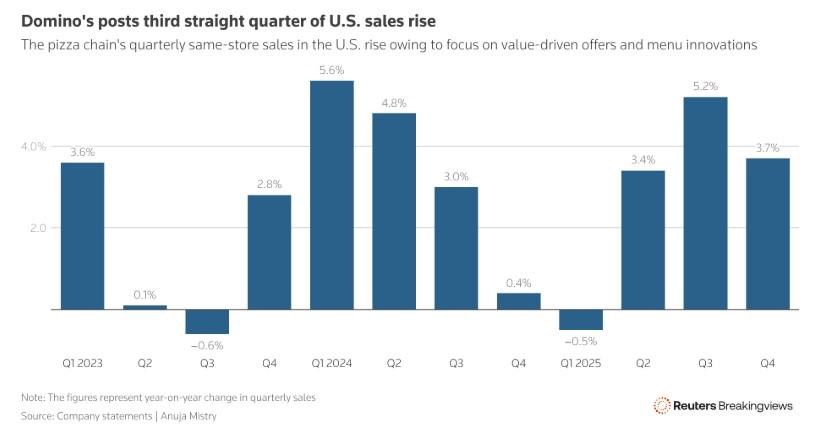 Το κόλπο λειτούργησε και έτσι στο τέταρτο τρίμηνο, οι πωλήσεις ίδιων καταστημάτων στα Domino’s στις ΗΠΑ αυξήθηκαν κατά 3,7%, ξεπερνώντας τις εκτιμήσεις των αναλυτών για 3,47%, σύμφωνα με στοιχεία που συγκέντρωσε η LSEG.