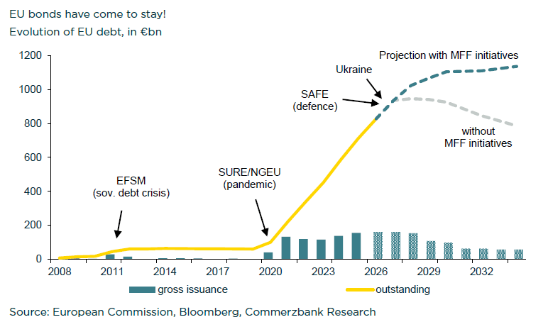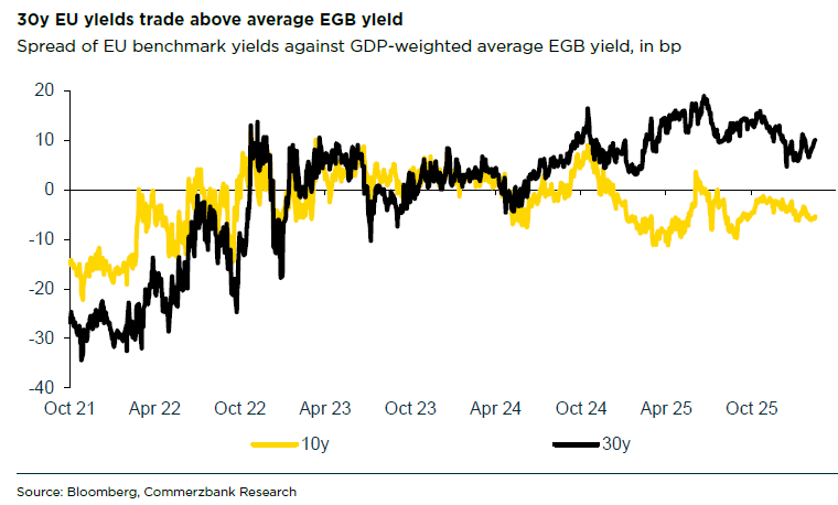 Η Commerzbank, όμως, εμφανίζεται επιφυλακτική απέναντι σε αυτή τη λογική. Όπως επισημαίνει, σε μια περίοδο διόγκωσης του δημόσιου χρέους διεθνώς, το μεγαλύτερο μέγεθος εκδόσεων δεν συνεπάγεται αυτομάτως καλύτερους όρους χρηματοδότησης ή υψηλότερη ρευστότητα. Ακόμη και σήμερα, με ετήσιες εκδόσεις που αγγίζουν τα 160 δισ. ευρώ, η Ευρωπαϊκή Επιτροπή έχει ήδη διευρύνει σημαντικά την παρουσία της στις αγορές, χωρίς αυτό να έχει εξαλείψει το λεγόμενο «discount» των ευρωπαϊκών ομολόγων έναντι άλλων αξιολογημένων εκδοτών.