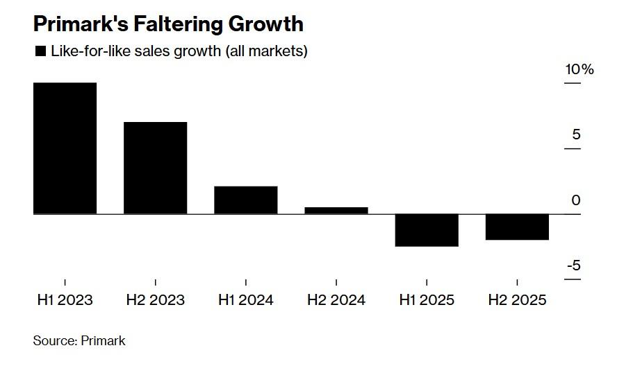 Οι πωλήσεις της Primark παρέμειναν σταθερές στο τελευταίο οικονομικό έτος που έληξε τον Σεπτέμβριο στα 9,5 δισεκατομμύρια λίρες (12,8 δισεκατομμύρια δολάρια). Η αύξηση των κερδών επιβραδύνθηκε επίσης από το 2024.