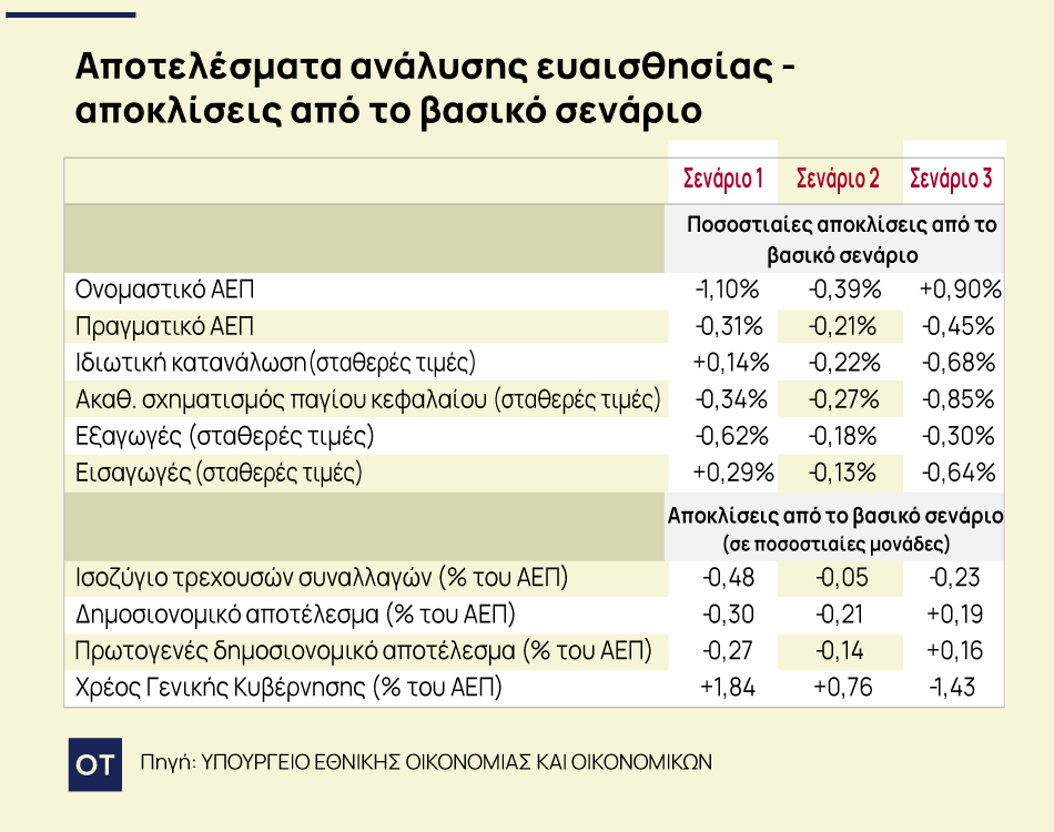 ο πρώτο σενάριο εξετάζει τις επιπτώσεις μίας ανατίμησης του ευρώ σε σχέση με το δολάριο κατά 10%. Το δεύτερο σενάριο εξετάζει τις επιπτώσεις μίας αύξησης του επιτοκίου κύριων πράξεων αναχρηματοδότησης της ΕΚΤ κατά 100 μονάδες βάσης. Το τρίτο σενάριο εξετάζει τις επιπτώσεις μίας αύξησης της διεθνούς τιμής του πετρελαίου κατά 40 δολάρια ανά βαρέλι. Η υπόθεση που γίνεται και στα τρία σενάρια είναι ότι οι παραπάνω εναλλακτικές υποθέσεις παραμένουν σε ισχύ καθ’ όλη τη διάρκεια του 2026. Σημειώνεται ότι αυτά τα σενάρια είναι υποθετικά και αποσκοπούν στην αποτύπωση της ευαισθησίας των οικονομικών μεγεθών σε ακραίες διακυμάνσεις των εξωτερικών υποθέσεων.