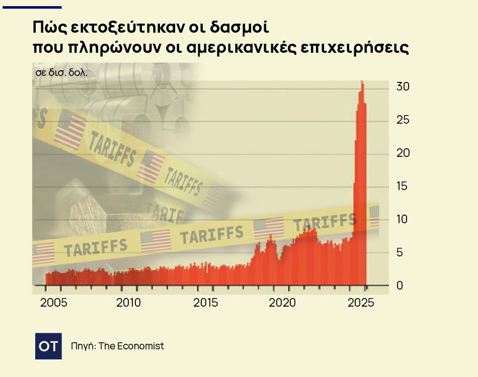Για πολλές εταιρείες, το κόστος των δασμών κάθε άλλο παρά αμελητέο ήταν. Από τον Απρίλιο, το ποσό που καταβάλλουν οι εισαγωγείς στο υπουργείο Οικονομικών κάθε μήνα έχει αυξηθεί από περίπου 6 δισεκατομμύρια δολάρια σε 30 δισεκατομμύρια δολάρια (βλ. διάγραμμα).