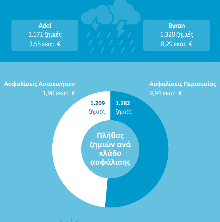σε 1.171 ζημιές, το ύψος των οποίων εκτιμάται συνολικά σε 3,6 εκατ. ευρώ. Από αυτές, 389 ζημιές αφορούσαν τις ασφαλίσεις περιουσίας (εκτίμηση αποζημιώσεων 2,5 εκατ. ευρώ) και 782 ζημιές τις ασφαλίσεις αυτοκινήτων (εκτίμηση 1,1 εκατ. ευρώ).