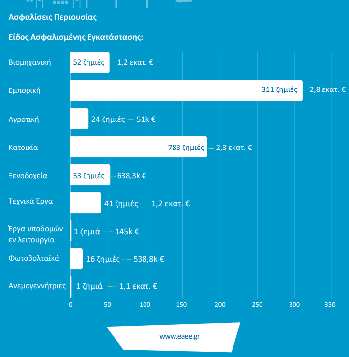 Οι συμμετέχουσες στην έρευνα ασφαλιστικές επιχειρήσεις δήλωσαν ζημιές σε εγκαταστάσεις σε όλες τις κατηγορίες (κατοικίες, εμπορικές, βιομηχανικές, αγροτικές και φωτοβολταϊκές εγκαταστάσεις, ξενοδοχεία, τεχνικά έργα, έργα υποδομών εν λειτουργία καιανεμογεννήτριες) των οποίων η συνολική ασφαλισμένη αξία ήταν 2,1 δισ. ευρώ.