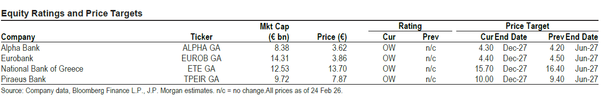 Η JP Morgan προχώρησε και σε μικρές αναθεωρήσεις των τιμών στόχων των ελληνικών τραπεζών. Για την Alpha Bank η τιμή στόχος αυξάνεται στα 4,30 ευρώ, από 4,20 ευρώ προηγουμένως, όπως και για την Πειραιώς στα 10 ευρώ, από 9,40 ευρώ, ενώ για την Eurobank μειώνεται στα 4,40 ευρώ, από 4,50 ευρώ, και για την Εθνική στα 15,70 ευρώ, από 16,40 ευρώ.