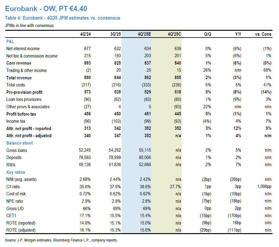 Για την Alpha Bank, η JP Morgan εκτιμά καθαρά κέρδη ύψους 214 εκατ. ευρώ για το δ’ τρίμηνο του 2025, επίδοση κατά 4% υψηλότερη από τη μέση εκτίμηση της αγοράς, κυρίως λόγω αυξημένων εσόδων από συναλλαγές και λοιπές δραστηριότητες.
