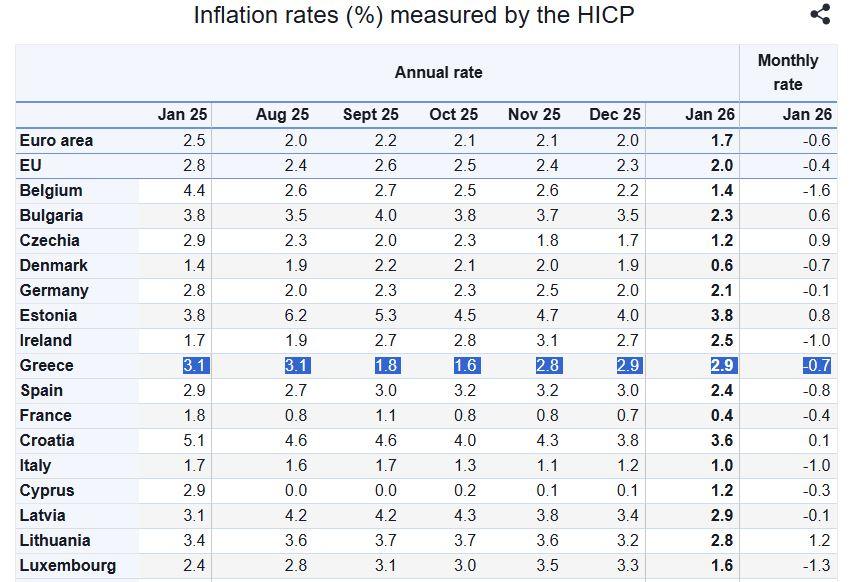 Ο ετήσιος πληθωρισμός στην ευρωζώνη ήταν 1,7% τον Ιανουάριο του 2026, έναντι 2,0% τον Δεκέμβριο. Έναν χρόνο νωρίτερα, ο πληθωρισμός ήταν 2,5%. Ο ετήσιος πληθωρισμός στην Ευρωπαϊκή Ένωση ήταν 2,0% τον Ιανουάριο του 2026, έναντι 2,3% τον Δεκέμβριο. Ένα χρόνο νωρίτερα, ο πληθωρισμός ήταν 2,8%. Τα στοιχεία αυτά δημοσιεύονται από την Eurostat, τη στατιστική υπηρεσία της Ευρωπαϊκής Ένωσης.