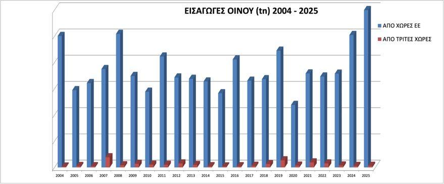 Παράλληλα με την αύξηση εισαγωγών σε αξία, αύξηση κατά 8,51% παρουσιάζουν οι ποσότητες εισαγωγής οίνων από Τρίτες Χώρες (282 tn/2024 – 306 tn/2025).