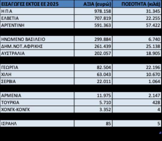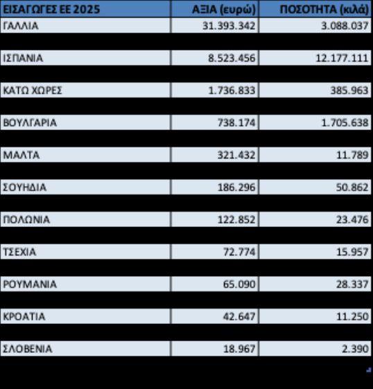 Αποτέλεσμα της συνεχιζόμενης ανόδου των εισαγωγών ήταν και το ότι για δεύτερη χρονιά στα χρονικά οι εισαγωγές σε ποσότητα το 2025 (30.291.109 kg) υπερσκέλισαν τις αντίστοιχες εξαγωγές (28.201.726 kg).