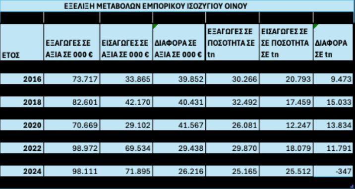Τέλος πρέπει να επισημανθεί ότι η εικόνα του εμπορικού ισοζυγίου οίνου βαίνει μειούμενη ως προς το θετικό του πρόσημο σε αξία, ενώ για δεύτερη φορά το 2025 εξελίσσεται με αρνητικό πρόσημο ως προς την ποσότητα, σύμφωνα με τον πίνακα που ακολουθεί: