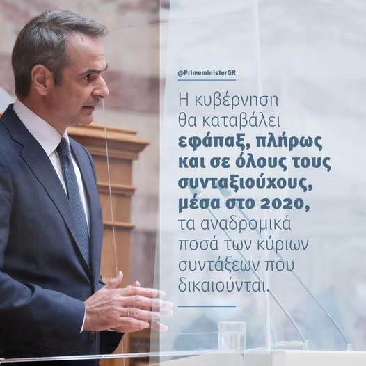 29 Ιουλίου 2020 (Δημοσίευση του χρήστη Kyriakos Mitsotakis): «Η κυβέρνηση θα καταβάλει μέσα στο 2020 τα αναδρομικά που δικαιούνται οι συνταξιούχοι …»