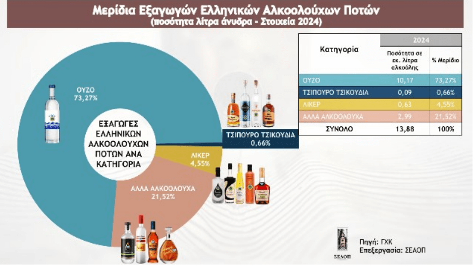 Ο κλάδος της ελληνικής ποτοποιίας και αποσταγματοποιίας, παρά τις προκλήσεις, διατήρησε την εξωστρέφειά του, με αύξηση των εξαγωγών. Η συνολική ποσότητα των εξαγωγών αυξήθηκε κατά +3%, (δηλαδή 1,4 εκ. φιάλες), φθάνοντας τα 13,9 εκατ. λίτρα αλκοόλης από 13,5 εκατ. λίτρα το 2023. Σύμφωνα με τα στοιχεία της EUROSTAT, που επεξεργάσθηκε ο ΣΕΑΟΠ, η αξία των εξαγωγών, το 2024 ξεπέρασε για 2η συνεχή χρονιά, το φράγμα των 100 εκ.€. (114, 5 εκ. € έναντι 106,2 εκ. € το 2023). Σε ορίζοντα δεκαετίας (2015–2024), οι εξαγωγές εμφανίζουν συνολική αύξηση +16,6%.