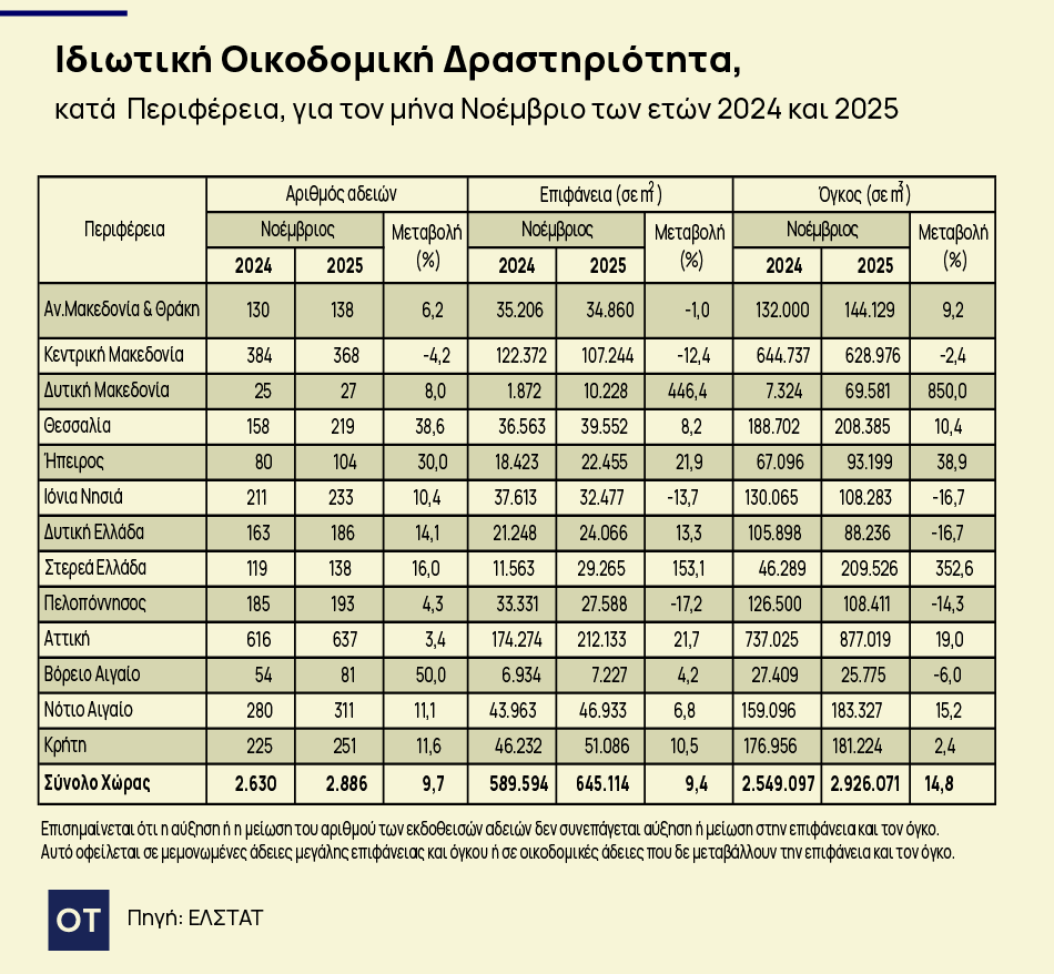 Οι εκδοθείσες άδειες Ιδιωτικής Οικοδομικής Δραστηριότητας, στο σύνολο της Χώρας, κατά τον μήνα Νοέμβριο 2025 ανήλθαν σε 2.886 οικοδομικές άδειες, που αντιστοιχούν σε 645.114 m2 επιφάνειας και 2.926.071 m3 όγκου, παρουσιάζοντας αύξηση κατά 9,7% στον αριθμό των οικοδομικών αδειών, αύξηση κατά 9,4% στην επιφάνεια και αύξηση κατά 14,8% στον όγκο, σε σχέση με τον αντίστοιχο μήνα του 2024.