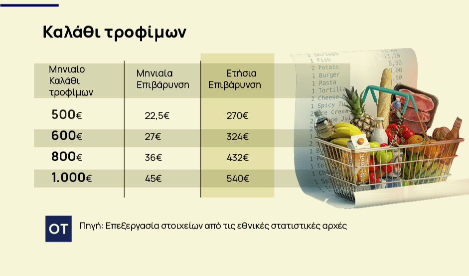 Σε ένα νοικοκυριό που δαπανά 300 ευρώ τον μήνα για τρόφιμα, το +4,5% σημαίνει 13,5 ευρώ επιπλέον κάθε μήνα ή 162 ευρώ το χρόνο. Αντίστοιχα, ένα νοικοκυριό που δαπανά 600 ευρώ το μήνα, ο λογαριασμός θα είναι αυξημένος κατά 27 ευρώ το μήνα ή 324 ευρώ τον χρόνο.