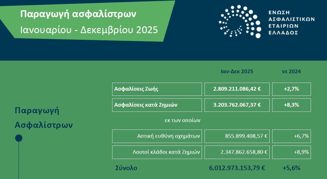 Στα 6,01 δισ. ευρώ διαμορφώθηκαν οι ασφαλίσεις στην ελληνική αγορά το 2025, καταγράφοντας αύξηση 5,6% σε σύγκριση με το 2024, σύμφωνα με τη μηνιαία έρευνα της Ένωσης Ασφαλιστικών Εταιρειών Ελλάδος για την περίοδο Ιανουαρίου-Δεκεμβρίου 2025.