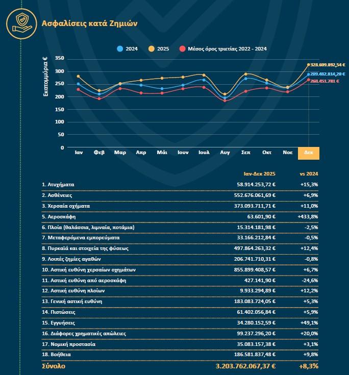 -Ασφαλίσεις κατά Ζημιών: 3.203.762.067,37 ευρώ (+8,3%)