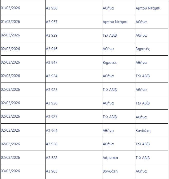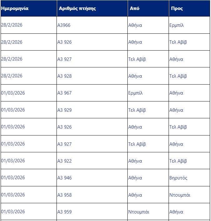 Επιπλέον, η AEGEAN ενημερώνει ότι, με στόχο τη διευκόλυνση των επιβατών που διαθέτουν εισιτήρια από και προς το Τελ Αβίβ, το Ερμπίλ, τη Βαγδάτη, τη Βηρυτό, το Αμπού Ντάμπι και το Ντουμπάι, για πτήσεις με προγραμματισμένη αναχώρηση έως και τις 10 Μαρτίου 2026, παρέχει, εφόσον το επιθυμούν, τη δυνατότητα τροποποίησης των πτήσεων είτε με δωρεάν επανέκδοση και αλλαγή των εισιτηρίων, χωρίς επιπλέον κόστος, για νέα ταξίδια με ημερομηνία αναχώρησης έως και τις 31 Μαρτίου 2026, είτε με ακύρωση της κράτησης και έκδοση credit voucher για μελλοντική χρήση.