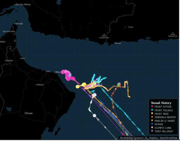 Το πετρελαιοφόρο Eagle Veracruz, που κατευθύνεται προς την Κίνα με 2 εκατομμύρια βαρέλια ιρακινού και εμιρατικού αργού πετρελαίου, έχει σταματήσει στη δυτική είσοδο του Στενού του Ορμούζ, όπου έχει ενωθεί με το Front Beauly, το οποίο μεταφέρει παρόμοια ποσότητα σαουδαραβικού αργού πετρελαίου.