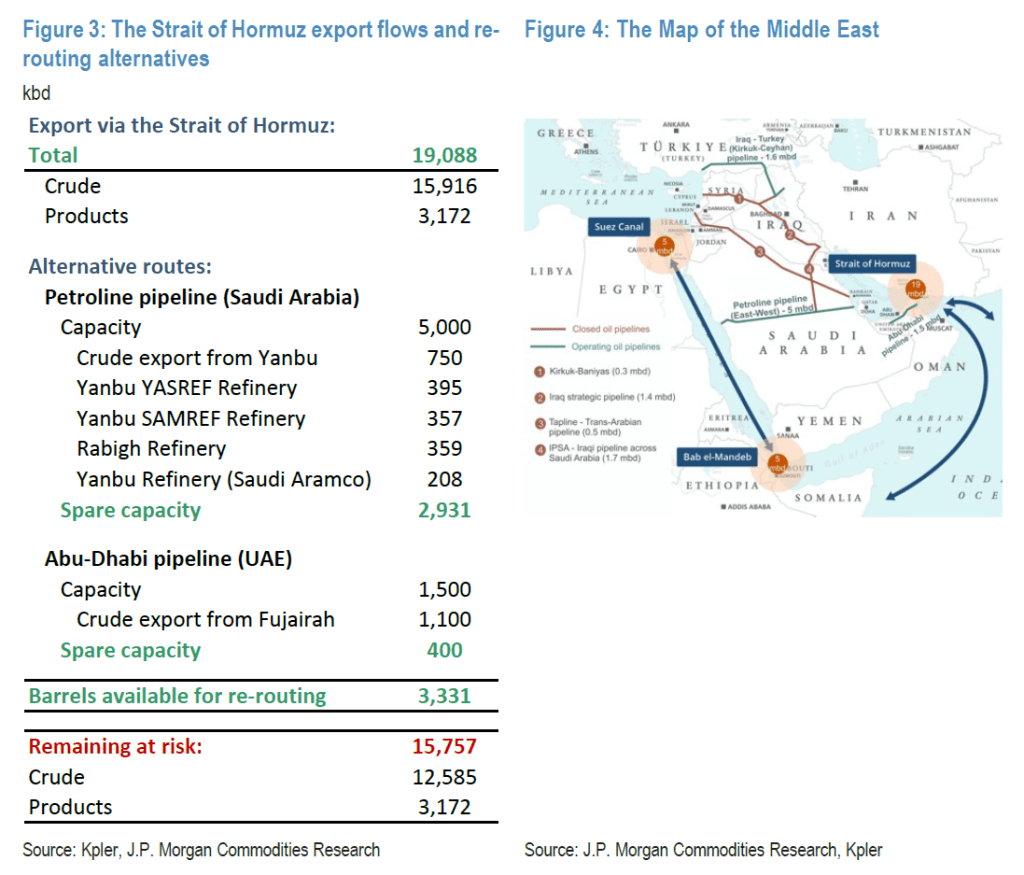 Η JP Morgan εκτιμά ότι οι παραγωγοί του Κόλπου μπορούν να διατηρήσουν την παραγωγή τους για περίπου 25 ημέρες, αξιοποιώντας αποθηκευτικούς χώρους και διαθέσιμα δεξαμενόπλοια. Πέραν αυτού του διαστήματος, θα αναγκαστούν σε υποχρεωτικές περικοπές παραγωγής.