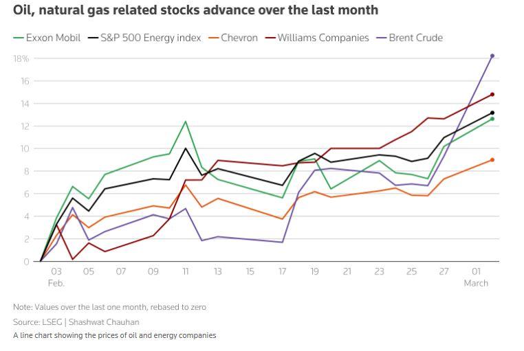 Οι μετοχές αμερικανικών και ευρωπαϊκών εταιρειών ενέργειας, συμπεριλαμβανομένων των Exxon Mobil και Shell ήταν από τις εταιρείες που σημείωσαν τα μεγαλύτερα κέρδη, ακολουθώντας την άνοδο των τιμών του αργού πετρελαίου κατά περισσότερο από 8%.