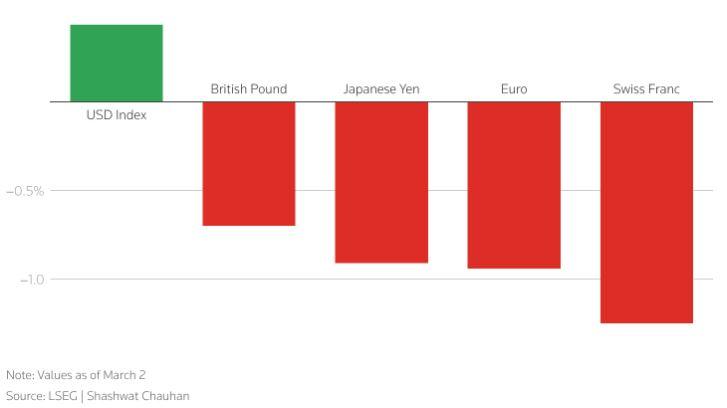 Γράφημα που δείχνει την απόδοση του δολαρίου σε σύγκριση με τα κύρια νομίσματα στις 2 Μαρτίου