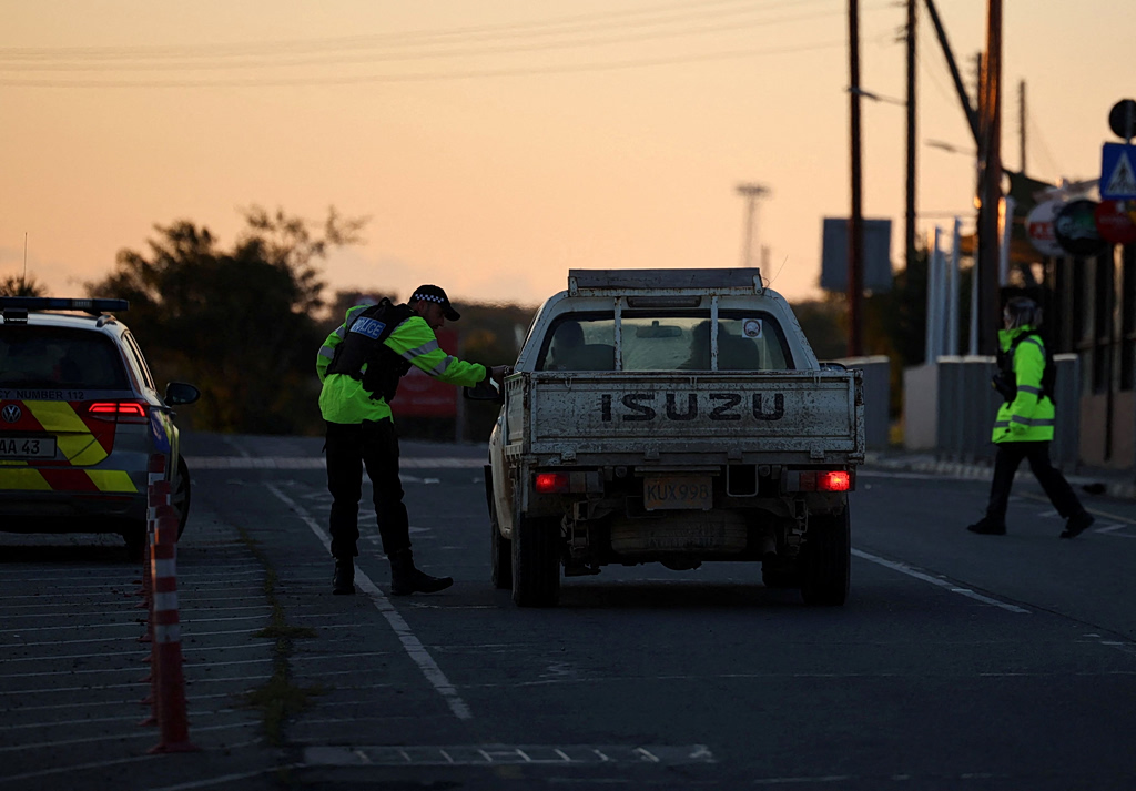 Police check vehicles on the road leading to RAF Akrotiri, a British sovereign base in Cyprus, which was hit by an unmanned drone overnight, causing limited damage, Cyprus March 2, 2026. REUTERS/Yiannis Kourtoglou