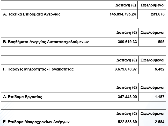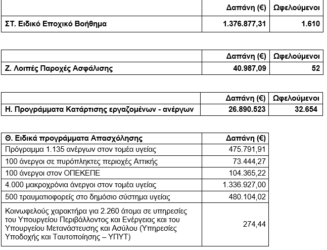 Οι συνολικές δαπάνες και ο αριθμός ωφελούμενων, ανά κατηγορία παροχών καθώς και οι δαπάνες για τα ειδικά προγράμματα απασχόλησης οργανωμένες σε εννέα βασικές κατηγορίες έχουν ως εξής: