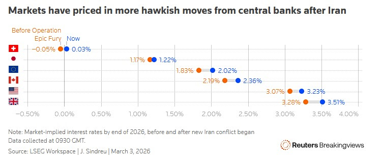 Από τη στιγμή που οι ΗΠΑ και το Ισραήλ εξαπέλυσαν την επίθεσή τους κατά του Ιράν το Σαββατοκύριακο, οι αγορές παραγώγων έχουν αποτιμήσει μια πιο επιθετική στάση των κεντρικών τραπεζών παγκοσμίως. Στην περιοχή της Ασίας-Ειρηνικού, όπου οι επενδυτές ήδη ανέμεναν νομισματική σύσφιγξη σε πολλές περιπτώσεις, τα overnight indexed swaps υποδηλώνουν ακόμη περισσότερες αυξήσεις.