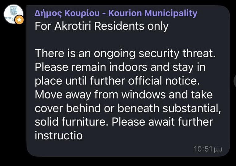 «Σε σχέση με την ενεργοποίηση μέτρων ασφαλείας που σημειώθηκε νωρίτερα στις Βρετανικές Βάσεις, διευκρινίζεται ότι δεν έχει εντοπιστεί οποιαδήποτε απειλή.