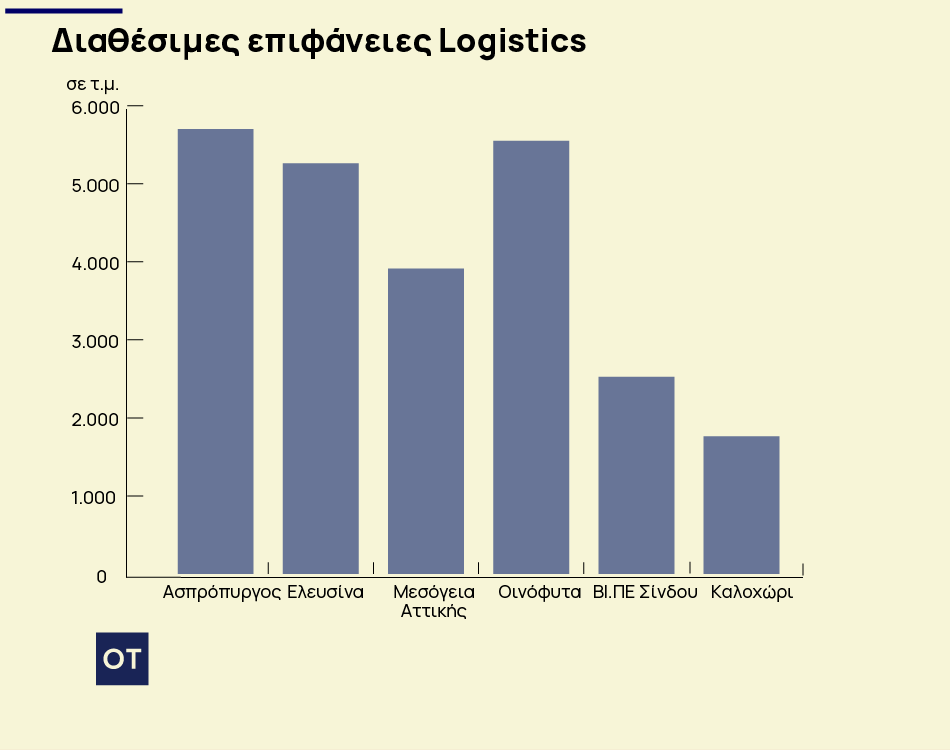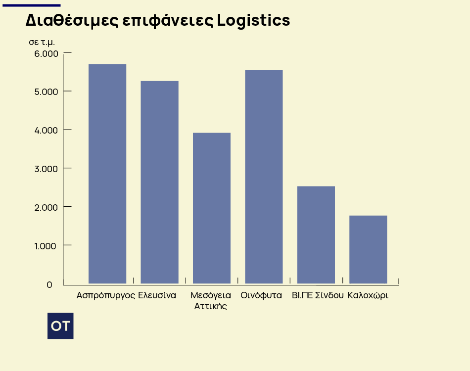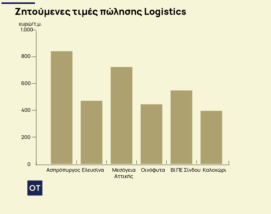 Εξετάζοντας τις διαθέσιμες προς πώληση υποδομές logistics, η Geoaxis σημειώνει ότι στο τέλος του 2025, η υψηλότερη διάμεση ζητούμενη τιμή πώλησης καταγράφεται στον Ασπρόπυργο με 841,71 €/τ.μ., δεύτερα σε σειρά είναι τα Μεσόγεια Αττικής με 723,62 €/τ.μ. και τρίτη έρχεται η ΒΙ.ΠΕ Σίνδου με 548,55 €/τ.μ.