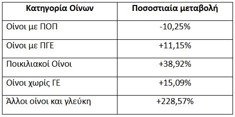 Επί του συνόλου της οινοπαραγωγής το μερίδιο των οίνων με ΠΟΠ ανέρχεται σε 8,20% (134.939 hl), των οίνων με ΠΓΕ σε 25,05% (412.103 hl), των ποικιλιακών οίνων σε 17,18% (282.712 hl), των οίνων χωρίς ΓΕ σε 49,29% (810.947 hl) και των άλλων οίνων σε 0,28%, ποσοστά που υποδηλώνουν την κατά το ήμισυ παραγωγή οίνων για μαζική κατανάλωση, έναντι της παραγωγής οίνων με Γεωγραφική Ένδειξη.